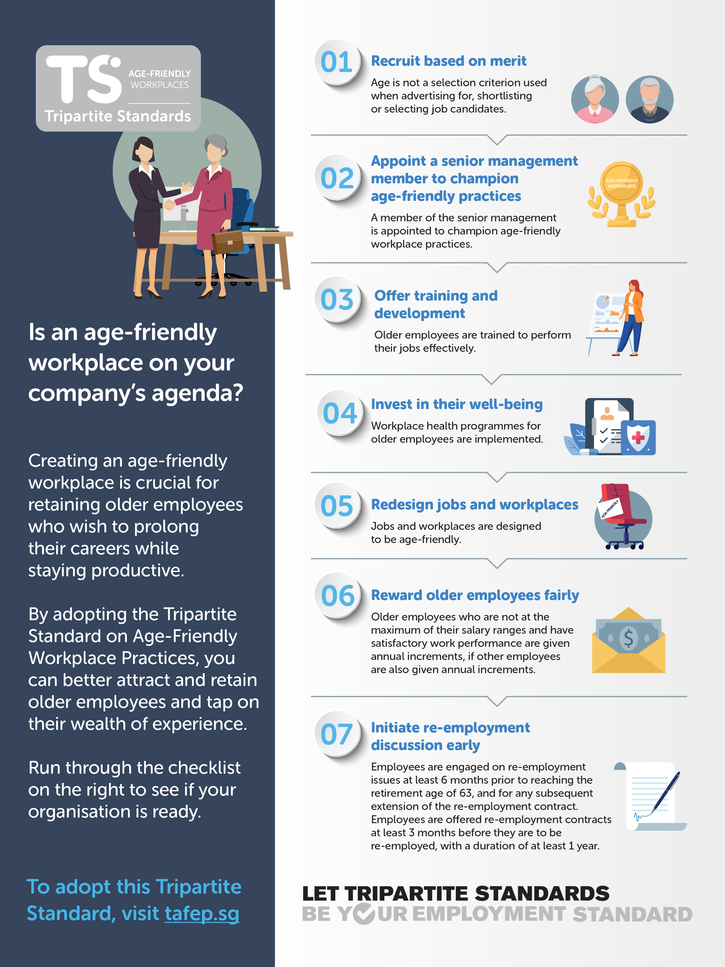 Tripartite Standard on Age-Friendly Workplace Practices Infographic summarises the 7 practices you need in order to adopt this Tripartite Standard.