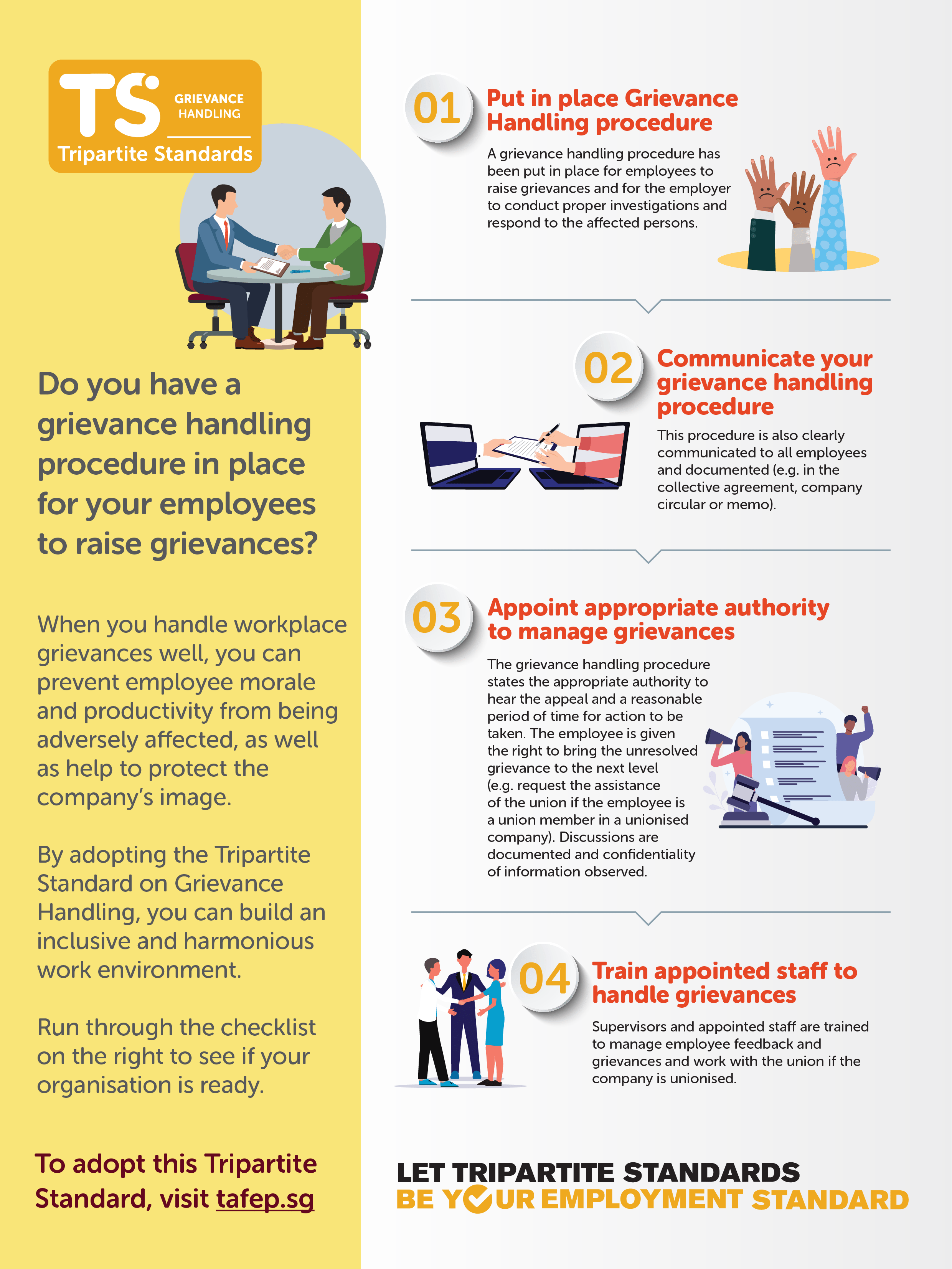 Tripartite Standard on Grievance Handling Infographic summarises the 4 practices you need in order to adopt this Tripartite Standard.