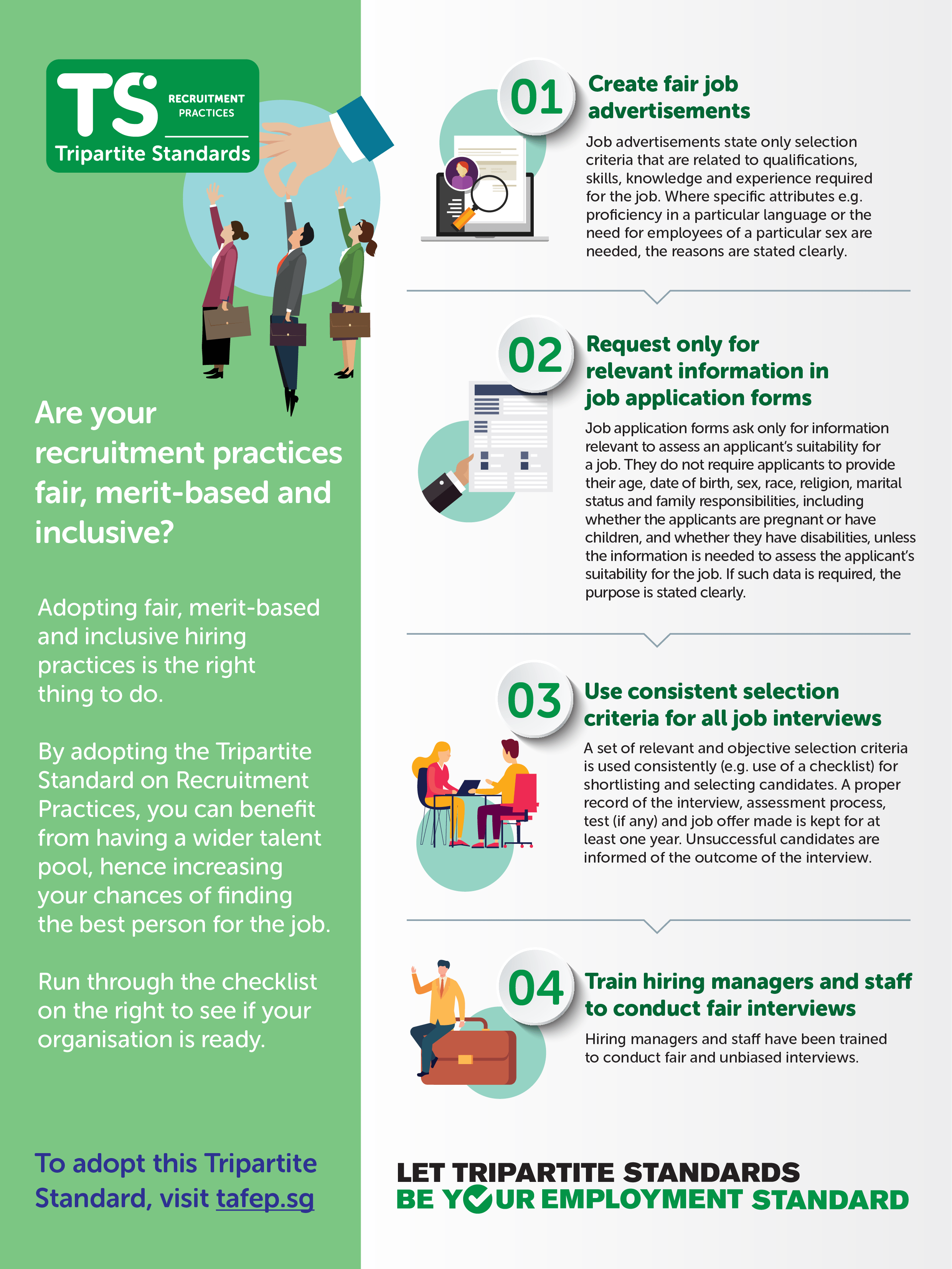 Tripartite Standard on Recruitment Practices Infographic summarises the 4 practices you need in order to adopt this Tripartite Standard.
