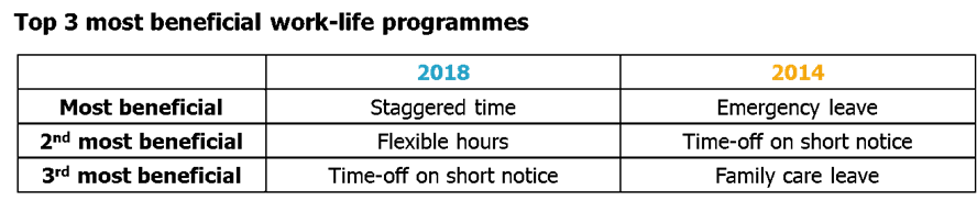 This was a shift away from the top 3 most beneficial FWAs cited in 2014 which were types of leave benefits: emergency leave, time-off on short notice, and family leave, suggesting that with FWAs, employees are able to integrate their work and life needs more effectively.