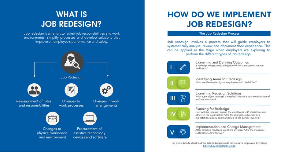 The latest guide by SG Enable, developed in collaboration with the Ministry of Manpower, is the Job Redesign Guide for Inclusive Employers. It aims to help employers understand how to redesign jobs to better support and integrate employees with disabilities in the workplace. It explains what job redesign is, how to implement it, and has case studies of organisations with best practices in job redesign.