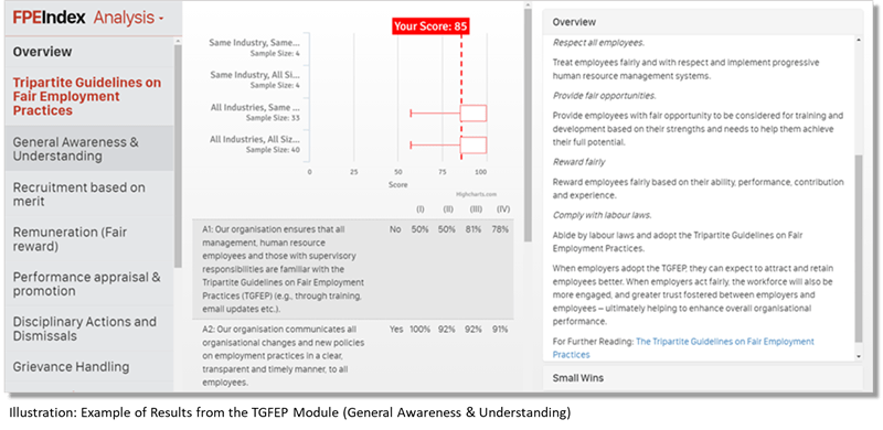 The newly added Tripartite Guidelines on Fair Employment Practices module (TGFEP module), developed in collaboration with the Institute for Human Resource Professionals (IHRP), helps employers identify how closely they adhere to the guidelines.