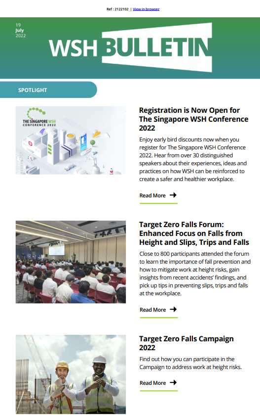 Organised by the Workplace Safety and Health (WSH) Council, the Target Zero Falls Campaign 2022 was launched on 14 July 2022 to increase awareness and education on preventing falls from heights, and to rally all industries to take serious actions on fall prevention.