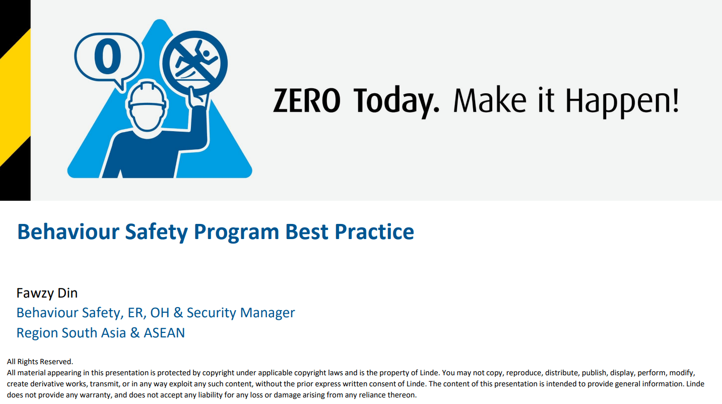 | 11.45am | Behavioural Based Safety Programme Mr Fawzy Din, Regional Behavioural Safety & Emergency Response Plan Manager, Linde Gas Asia Pte Ltd |
