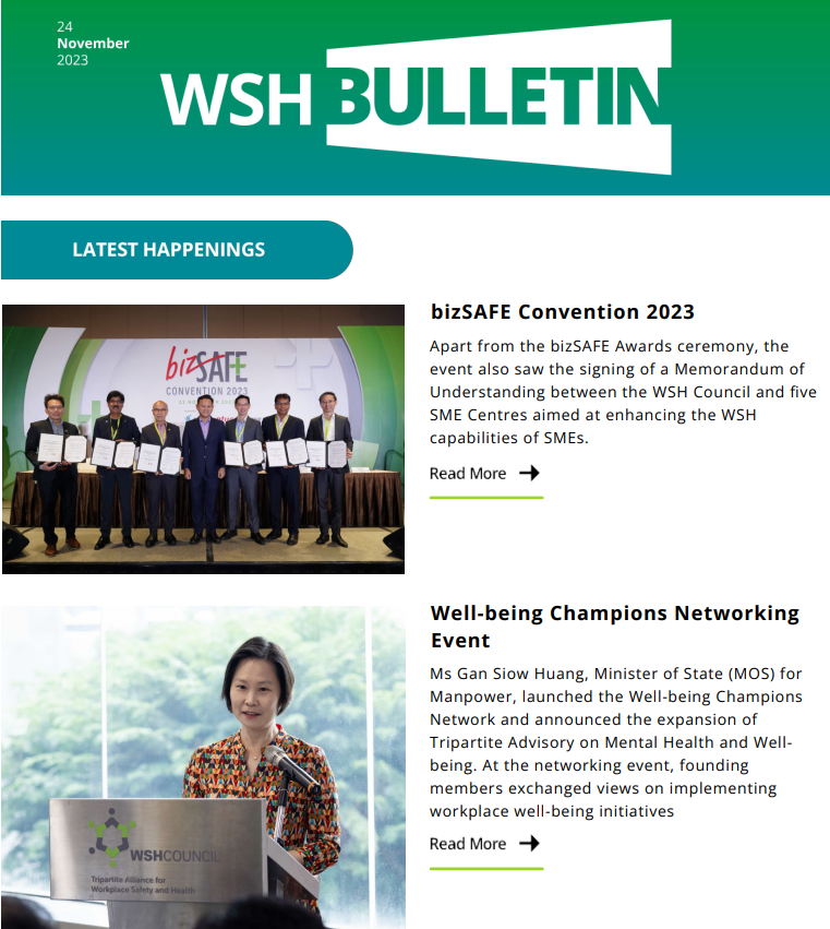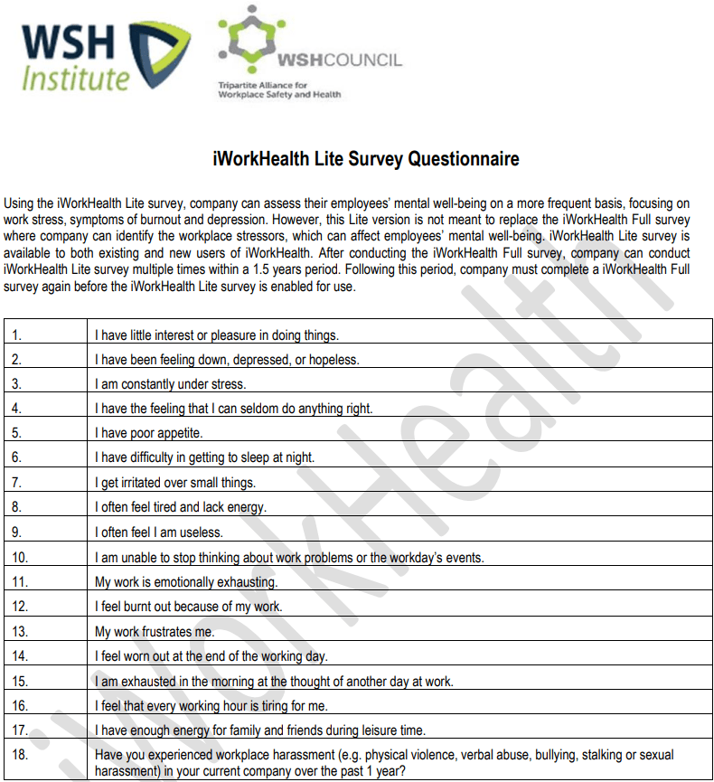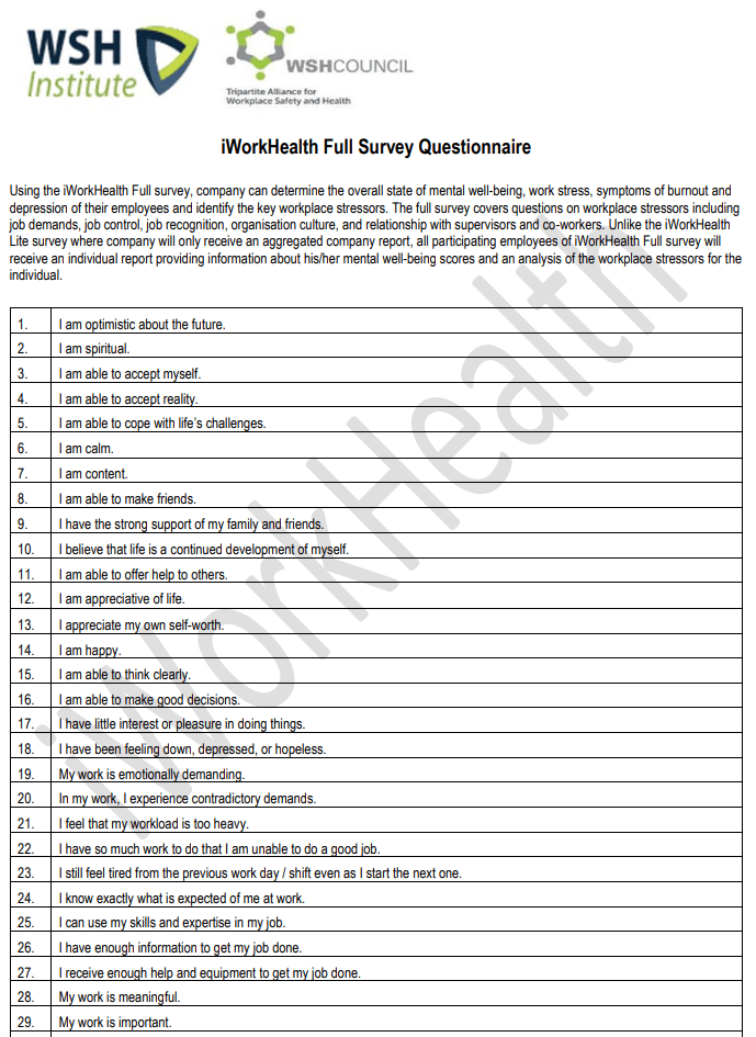 Developed by the Ministry of Manpower’s Workplace Safety and Health (WSH) Institute, in partnership with Changi General Hospital, Health Promotion Board, Institute of Mental Health and WSH Council, the iWorkHealth is a free online, company administered psychosocial health assessment tool that helps employers to understand their workforce’s state of well-being at work, covering work-related stress and burnout, and the key workplace stressors that employees are facing.