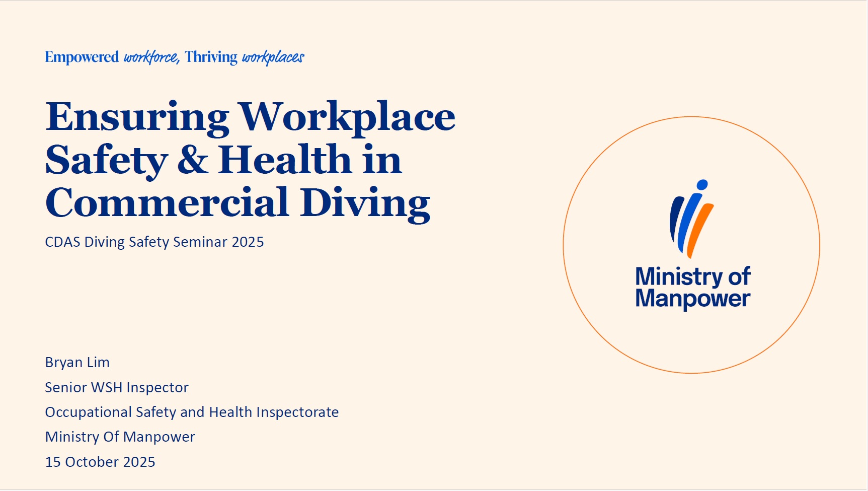 Presentation by Bryan Lim, Senior WSH Inspector, Occupational Safety and Health Inspectorate (MOM) at CDAS's Diving Safety Seminar