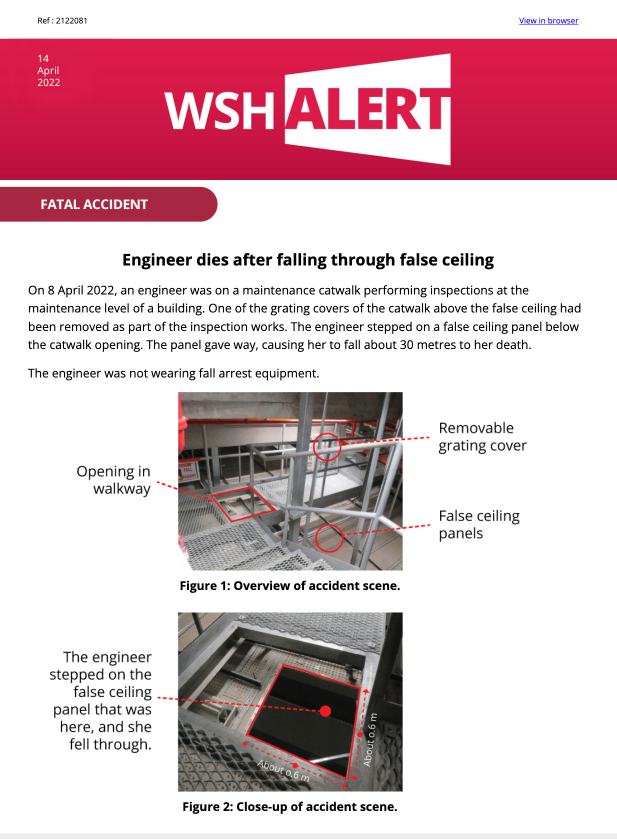 WSH Alert 14 April 2022 Fatal Accident Engineer dies after falling through false ceiling