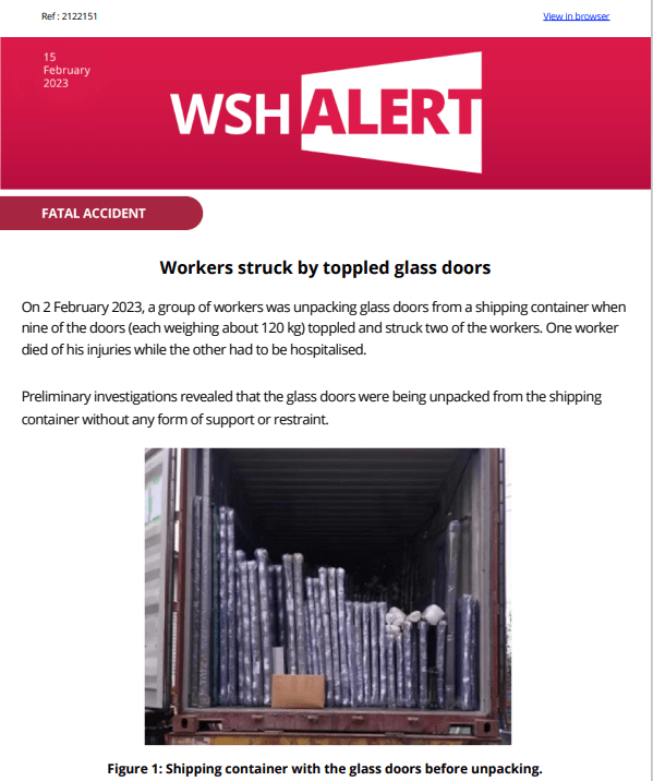 WSH Alert 15 Feb 2023 Workers struck by toppled glass doors
