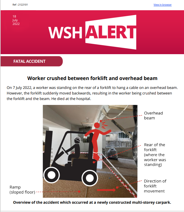 WSH Alert 18 July 2022 Fatal Accident Worker crushed between forklift and overhead beam