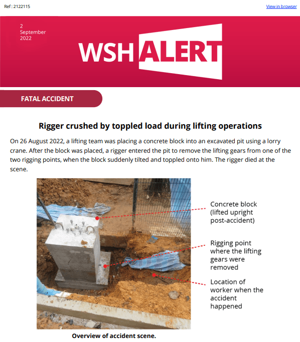 WSH Alert 2 Sep 2022 Fatal Accident Rigger crushed by toppled load during lifting operations