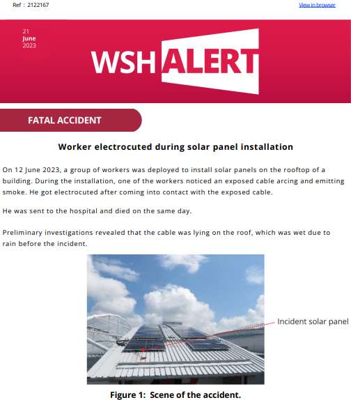 WSH Alert 21 June 2023 Worker electrocuted during solar panel installation