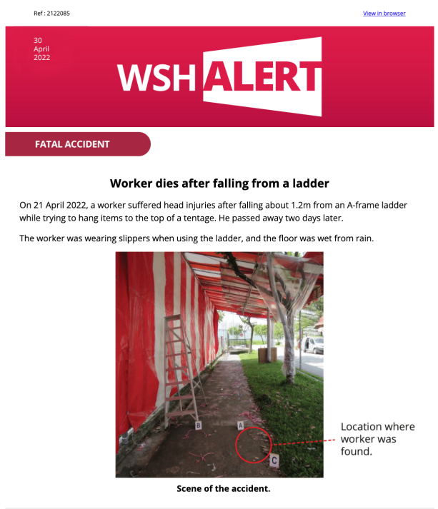 WSH Alert 30 Apr 2022 1 Worker dies after falling from ladder 2 Workers injured when boom lift fail