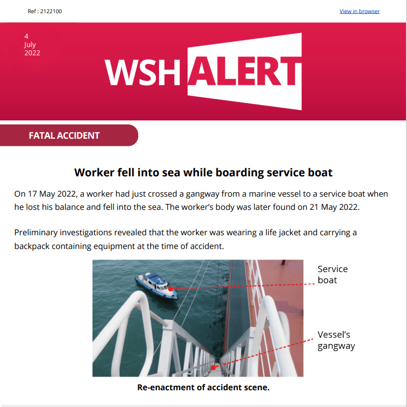 WSH Alert 4 July 2022 Fatal Accident Worker fell into sea while boarding service boat