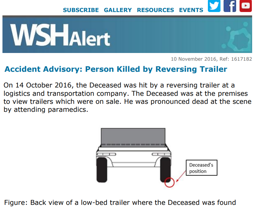 WSH Alert Accident Advisory 10 Nov 2016 Person Killed by Reversing Trailer