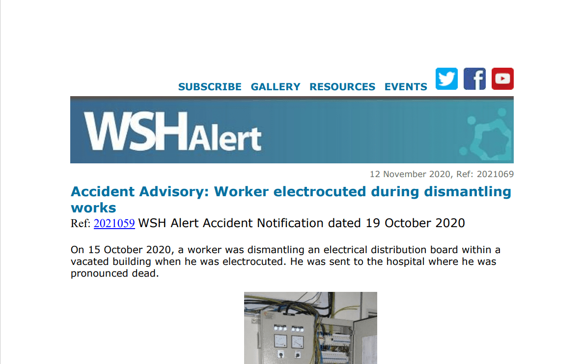 WSH Alert Accident Advisory 12 November 2020 Worker electrocuted during dismantling works