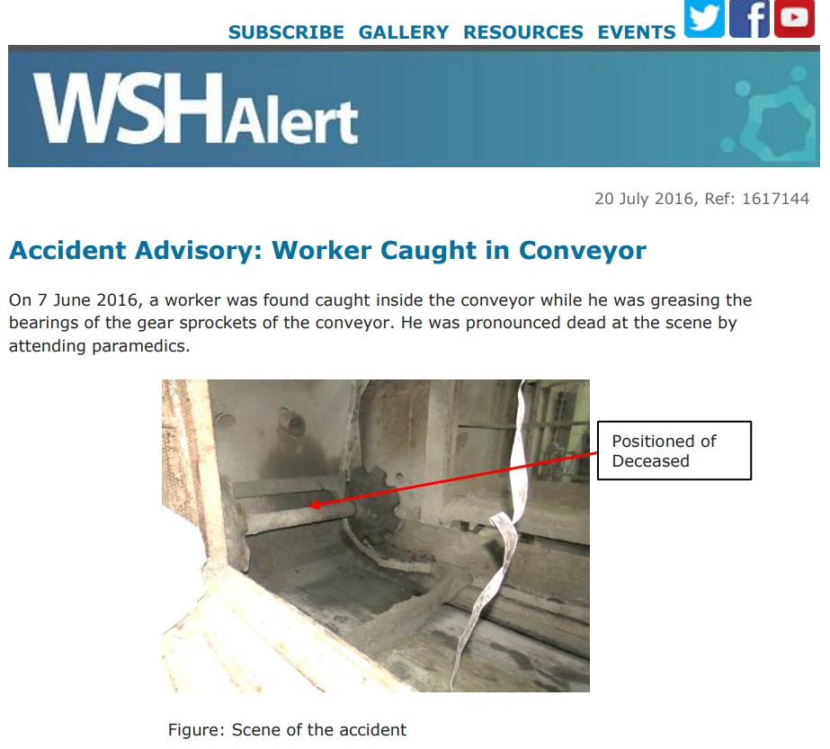 WSH Alert Accident Advisory 20 July 2016 Worker Caught in Conveyor