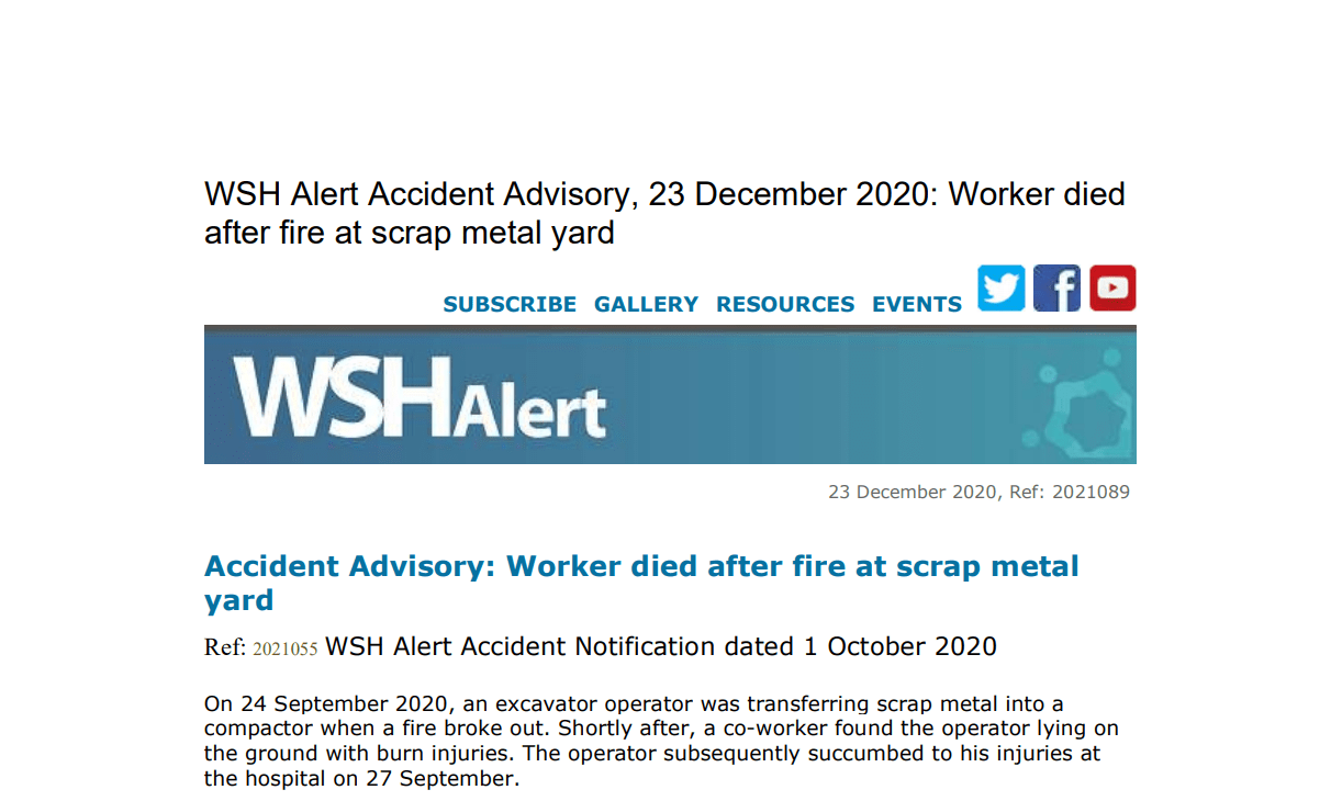 WSH Alert Accident Advisory 23 December 2020 Worker died after fire at scrap metal yard