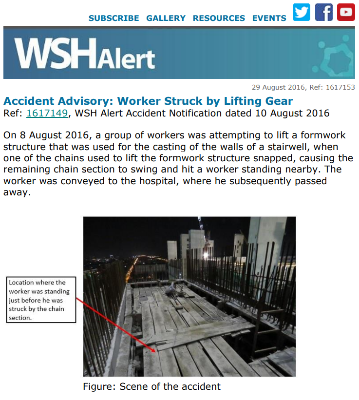 WSH Alert Accident Advisory 29 Aug 2016 Worker Struck by Lifting Gear