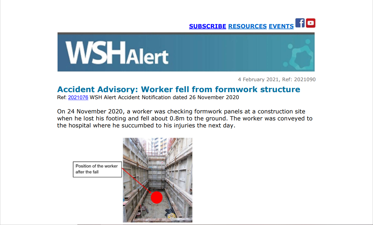 WSH Alert Accident Advisory 4 Feb 2020 Worker fell from formwork structure