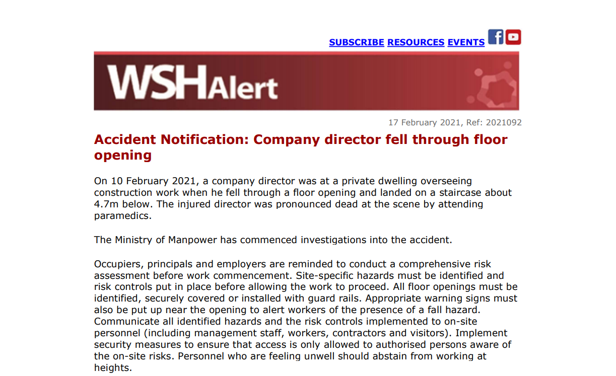 WSH Alert Accident Notification 17 Feb 2021 Company director fell through floor opening