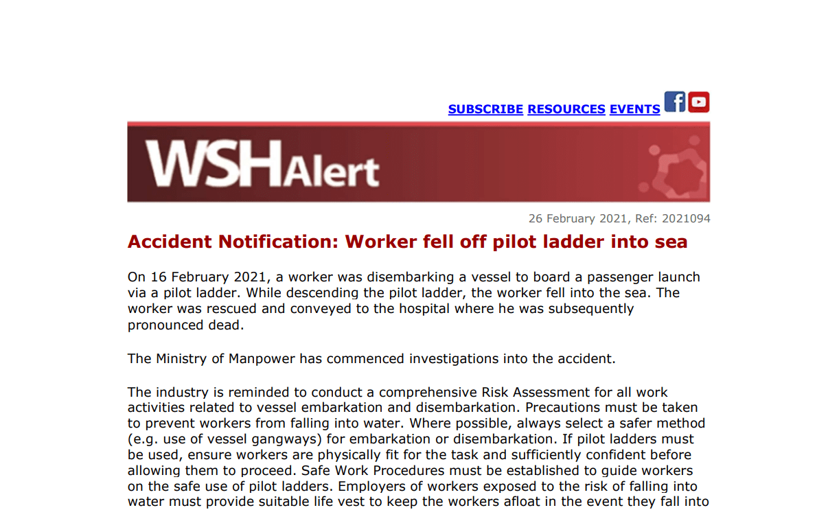 WSH Alert Accident Notification 26 Feb 2021 Worker fell off pilot ladder into sea