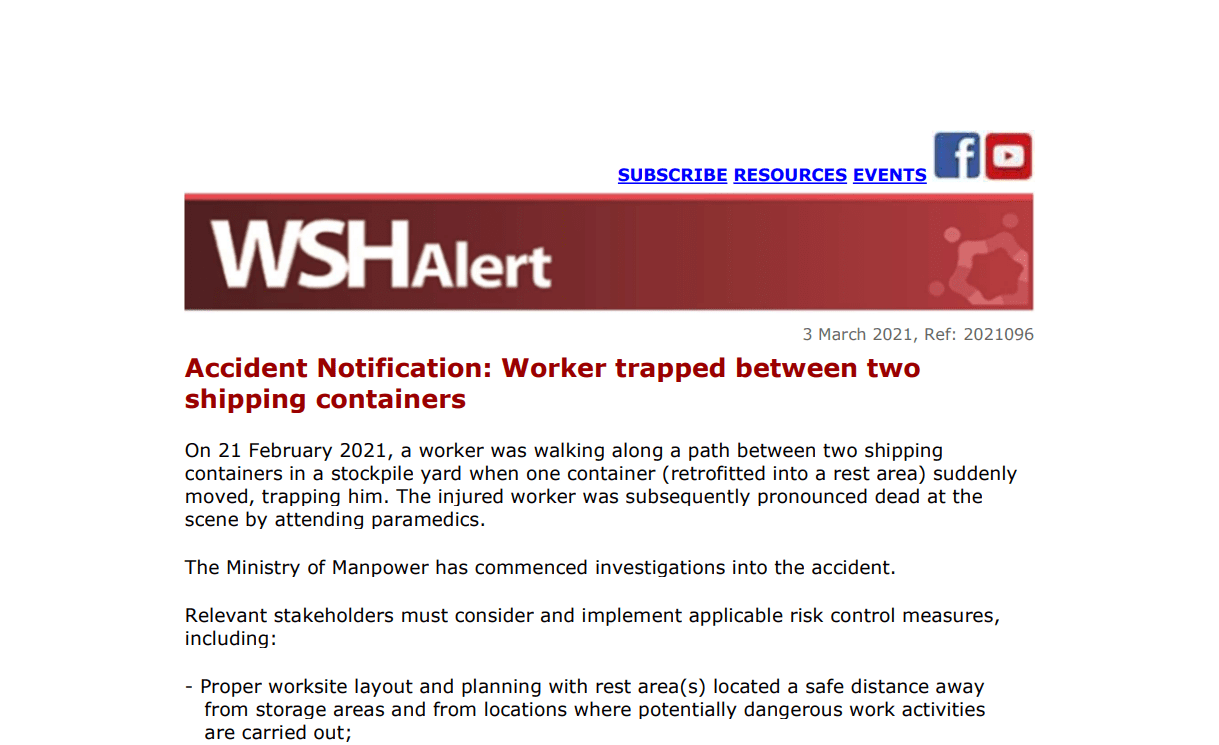 WSH Alert Accident Notification 3 March 2021 Worker trapped between two shipping containers