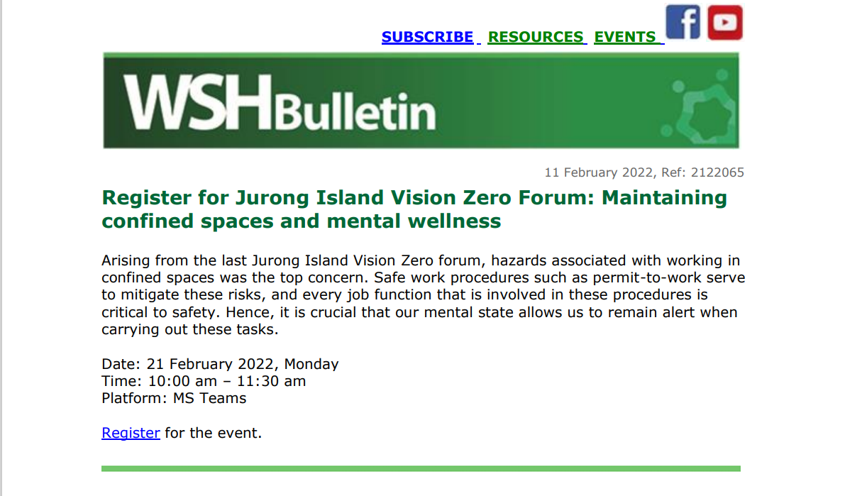WSH bulletin 11 Feb 2022 1 Jurong Island Vision Zero Forum 2 Training Provider Forum 3 ChemPact 2022