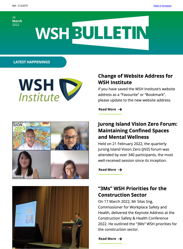 24 Mar 2022 Newsletters WSH Bulletins English Confined Spaces , Machinery Safety , Mental Well-being , Total WSH Chemical , Construction and Landscape , Hospitality and Entertainment , Manufacturing Total Workplace Safety and Health