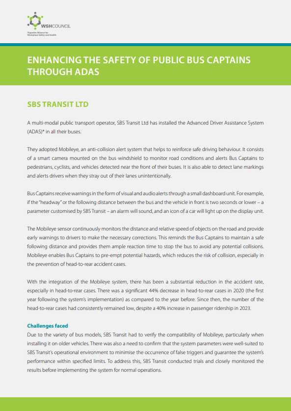 A multi-modal public transport operator, SBS Transit Ltd has installed the Advanced Driver Assistance System (ADAS) in all their buses.