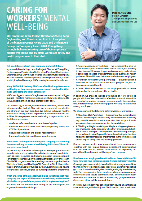 Mr Francis Ung is the Project Director at Zheng Keng Engineering and Construction Pte Ltd. A recipient of the bizSAFE Partner Award 2020 and the bizSAFE Enterprise Exemplary Award 2020, Zheng Keng strongly believes in taking care of their employees’ mental well-being and by offers workplace safety and health programmes to their staff.