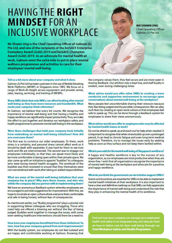 Award (Gold) 2019. As an advocate for mental health at work, Galmon went the extra mile to put in place mental wellness programmes and activities to care for their employees’ mental well-being.