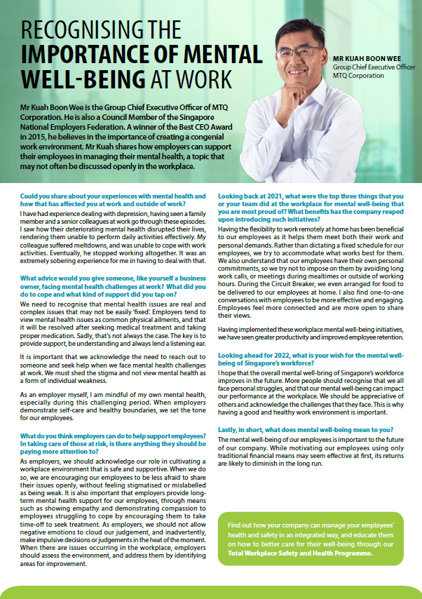 Mr Kuah Boon Wee is the Group Chief Executive Officer of MTQ Corporation. He is also a Council Member of the Singapore National Employers Federation. A winner of the Best CEO Award in 2015, he believes in the importance of creating a congenial work environment. Mr Kuah shares how employers can support their employees in managing their mental health, a topic that may not often be discussed openly in the workplace.