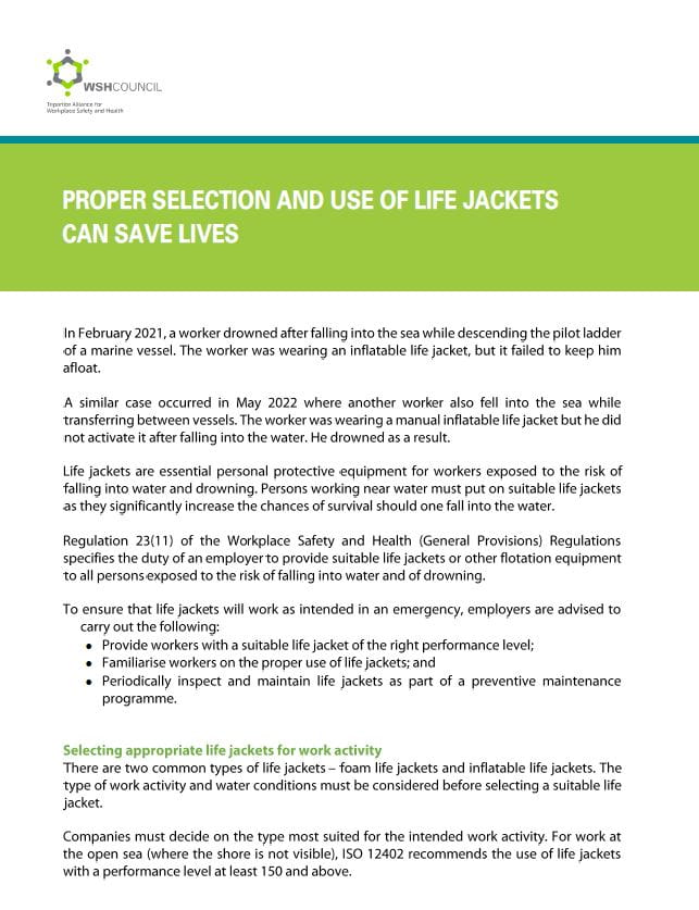 Life jackets are essential personal protective equipment for workers exposed to the risk of falling into water and drowning. Persons working near water must put on suitable life jackets as they significantly increase the chances of survival should one fall into the water.