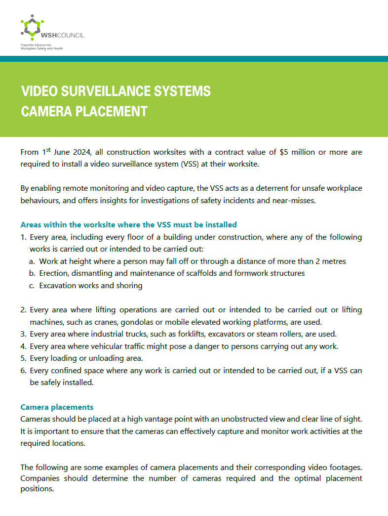 From 1st June 2024, all construction worksites with a contract value of $5 million or more are required to install a video surveillance system (VSS) at their worksite. By enabling remote monitoring and video capture, the VSS acts as a deterrent for unsafe workplace behaviours, and offers insights for investigations of safety incidents and near-misses.