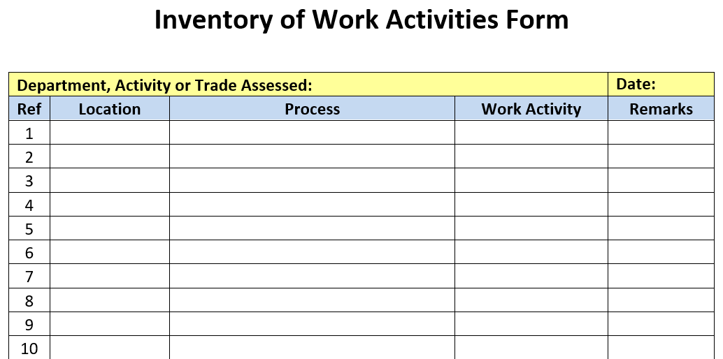 This form is to be completed before filling in the Risk Assessment Form. The content of the Work Activity column in the Inventory of Work Activities Form is to be copied over to the Work Activity column in the Risk Assessment Form.
