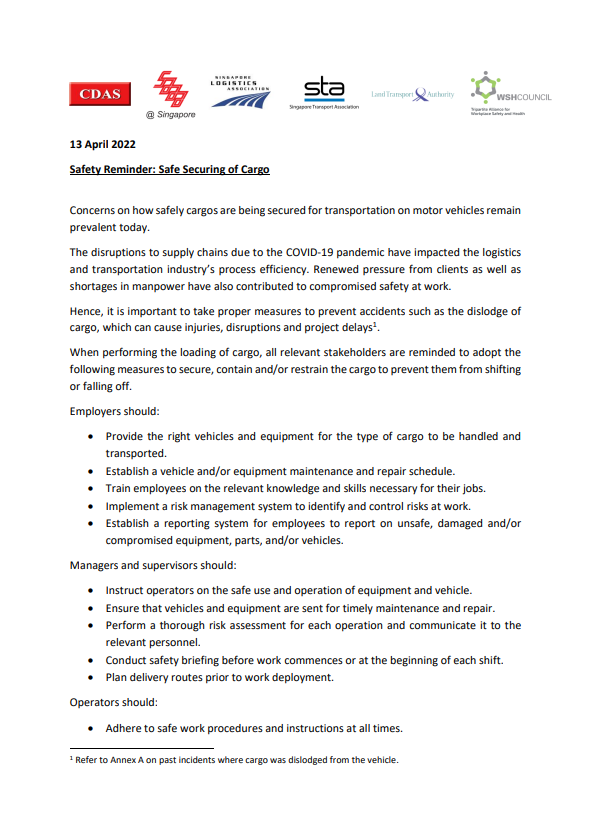 It is important to take proper measures to prevent accidents such as the dislodge of cargo, which can cause injuries, disruptions and project delays. When performing the loading of cargo, all relevant stakeholders are reminded to secure, contain and/or restrain the cargo to prevent them from shifting or falling off.